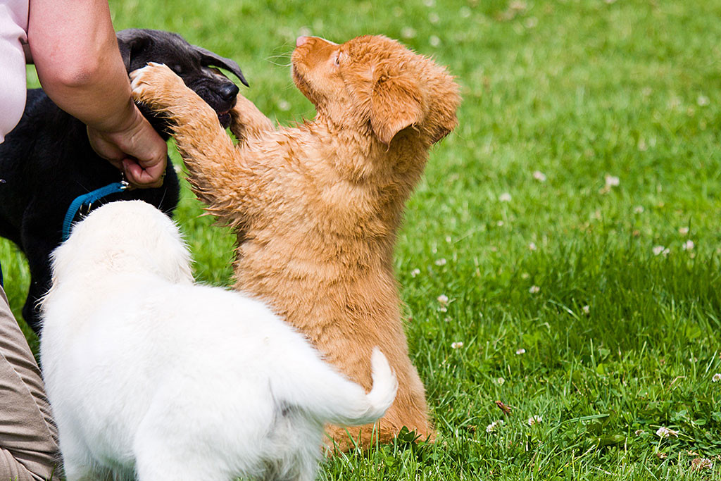 Als erstes hieß es nun, die Welpen kurz miteinander spielen zu lassen. Dazu sollten wir sie alle ableinen, sprich Leine und Halsband komplett entfernen. Hierbei wurde uns der Hinweis mit auf den Weg gegeben, dass wir unsere Hunde niemals selbst entscheiden lassen sollten, wann sie loslaufen. Wir sind in jeder Situation diejenigen, die den Zeitpunkt bestimmen. Das schützt die Hunde später vor Gefahrensituation, denn sie rennen so nicht von allein aus der Tür oder springen aus dem Kofferraum. D.h. nachdem wir sie ableinen, halten wir sie solange fest bis sie sich beruhigt haben. Sie sollten dabei weder winseln, bellen noch losstürmen wollen. Erst dann kommt unser Kommando wie z.B. Lauf oder Frei, woraufhin sie losgelassen werden und losrennen dürfen.
