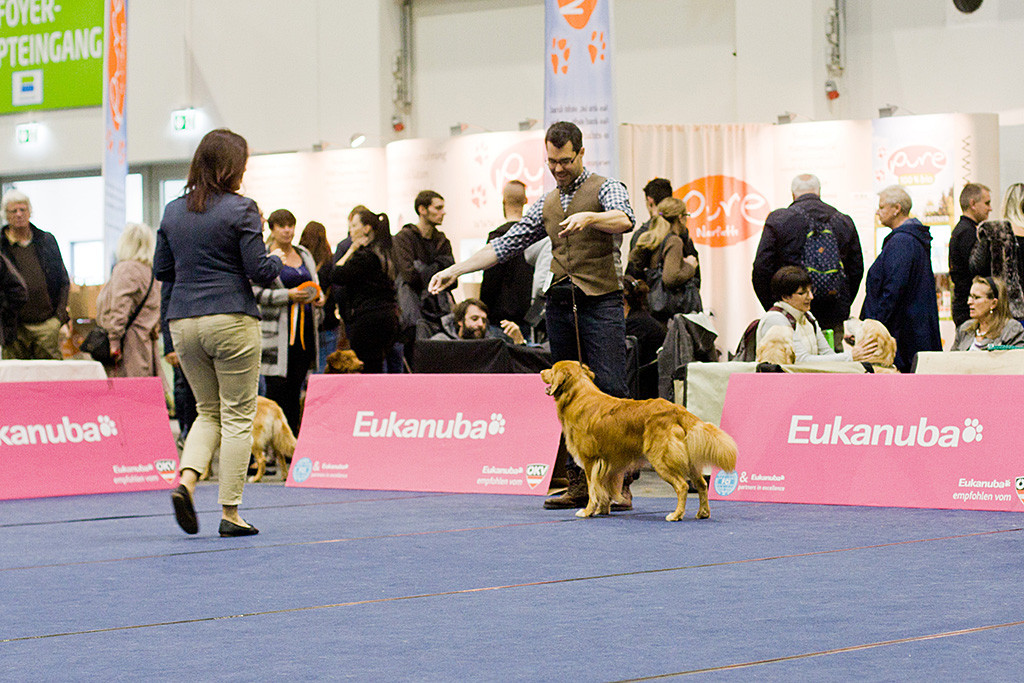 Dafür bekamen wir nach unserem längeren Fußmarsch einen guten Platz in der zweiten Reihe am Ring. Noch völlig geflasht vom gestrigen Tag liefen wir mit einem breiten Grinsen durch die Hallen. Im Gegensatz zu Grafenegg konnten wir unsere Klasse allerdings nicht mehr wechseln, da der Meldeschluss leider bereits vorbei war zum Zeitpunkt der Championtitel-Zuerkennung. Darum hieß es für uns: ein vorletztes Mal in der Offenen Klasse antreten. Diese bestritten wir zusammen mit Arduinas Flashing Kenai und Arduinas Elay, die bereits gestern in Grafenegg mit am Start waren.